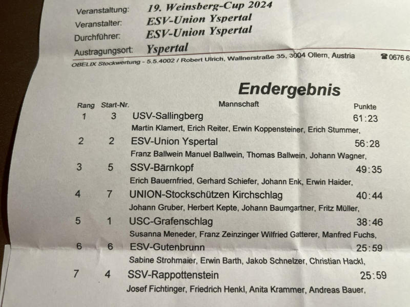 Nach einem tollen Abschlusstraining am Freitag fuhr eine Mannschaft am Samstag zum Weinsberg-Cupfinale nach Yspertal. Das Team mit Johann Gruber, Fritz Müller, Johann Baumgartner und Herbert Kepte, konnte den 4. Platz verteidigen.